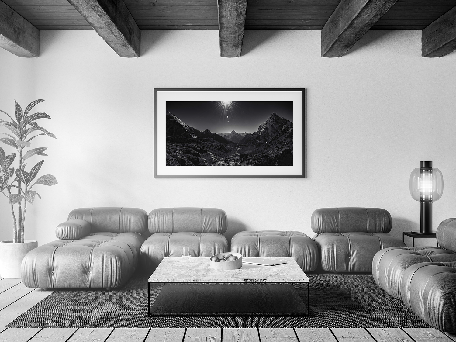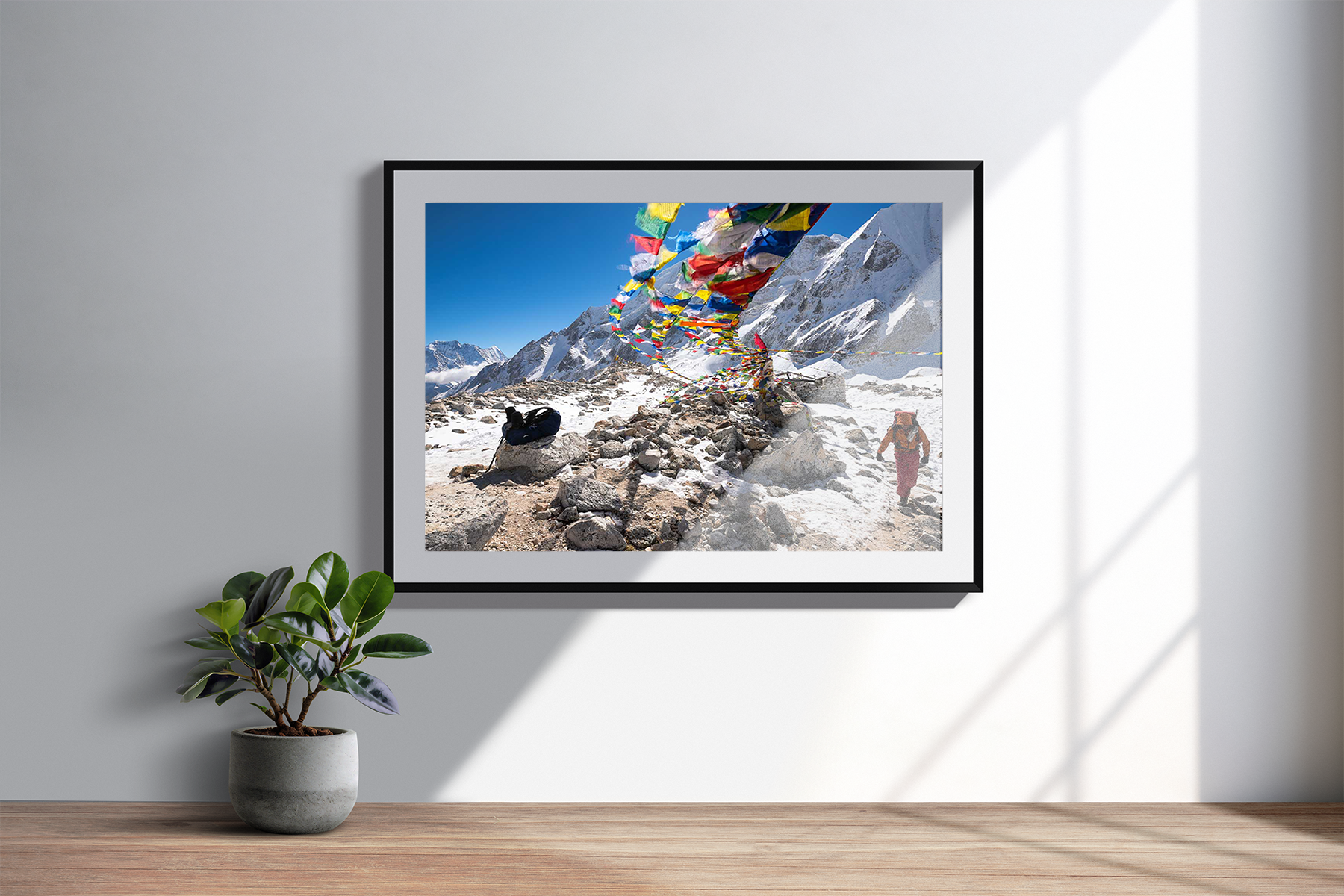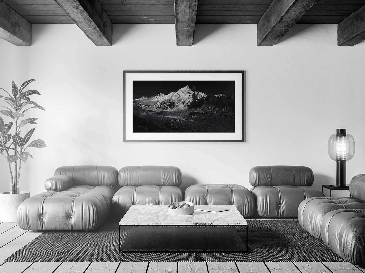 A unique and captivating perspective on the majestic embrace of Nuptse, Everest, and Lhotse. 1 x high-res .PNG, 7360x4750 px, 300+ dpi, RGB. Nature's majesty awaits! Download the image to give yourself the flexibility to have it professionally printed or framed, tailored to suit your personal style.